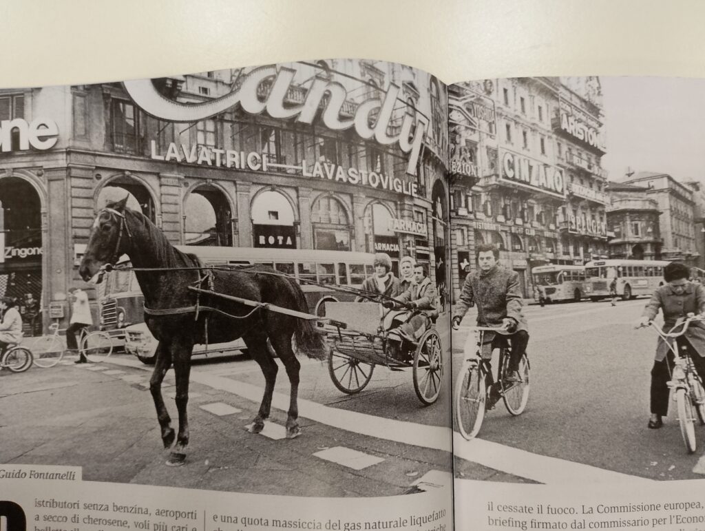 IMMAGINE RIPRESA DA UN ROTOCALCO TRADIZIONALE: PIAZZA DUOMO, LATO PALAZZO CARMINATI, INVERNO 1973-74, DURANTE L’AUSTERITY PETROLIFERA DI TALE PERIODO… SI NOTANO DUE AUTOBUS, ENTRAMBI FIAT 411 CAMERI, UNO VERDE MINISTERIALE L’ALTRO, PIU’ ARRETRATO, ARANCIONE, DELLE LINEE 74 (DUOMO Q.RE SANT’AMBROGIO) E 76 (DUOMO, VIA TERAMO) ISTITUITE DUE ANNI PRIMA. TALE LATO OVEST DELLA PIAZZA ERA IL CAPOLINEA DELLE SOSTITUTIVE 74 E 76 DEL TRAM 12 (CHE DAL GIUGNO 1971 VENNE SOPPRESSO NELLA TRATTA PIAZZA CORDUSIO, PIAZZA MIANI).