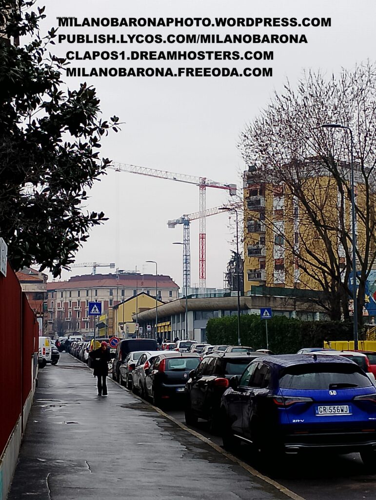 VIA FRANCO TOSI DA PIAZZA BILBAO… SI NOTA LA SELVA DI GRU (NEMMENO NEL MASSIMO SVILUPPO EDILIZIO ANNI ’50-70 DEL 900 VI ERANO TANTI CANTIERI EDILI…) DI CANTIERI DI SUBCONCESSIONARIE DEL LADRONE MANFREDI CATELLA E COMPANY… UNA PECULIARITÀ DI TALI CANTIERI È CHE I MEDESIMI VENGONO ERETTI NON LUNGO LE VIE MA IN CORTILETTI INTERNI DOVE È PERSINO DIFFICILE CAPIRE QUALE SIA IL PASSO CARRAIO, OVVERO NON SI VEDONO ACCESSI DALLE VIE DELL’ISOLATO CHE CONTIENE TALI GRU … GIUSEPPE SALA HA SPOSATO LA FILOSOFIA DI GABRIELE ALBERTINI, CHE INVENTO’ IL CONDOMINIO O LA TORRE RICAVATA NEL CORTILETTO INTERNO DI CHISSÀ QUALE CAPANNONE O FABBRICATO ARTIGIANALE, DA DEMOLIRSI… PROPRIO LUNGO LA VIA FRANCO TOSI, NEL 2001-02 VENNE EDIFICATO UN PALAZZO DI 10 PIANI IL CUI ACCESSO È POSSIBILE DA UN BUDELLO DI PASSO CARRAIO POSTO LUNGO LA VIA FRANCO TOSI, TUTTAVIA IL CONDOMINIO DISTA CIRCA 40 METRI INTERNI DALLA VIA…