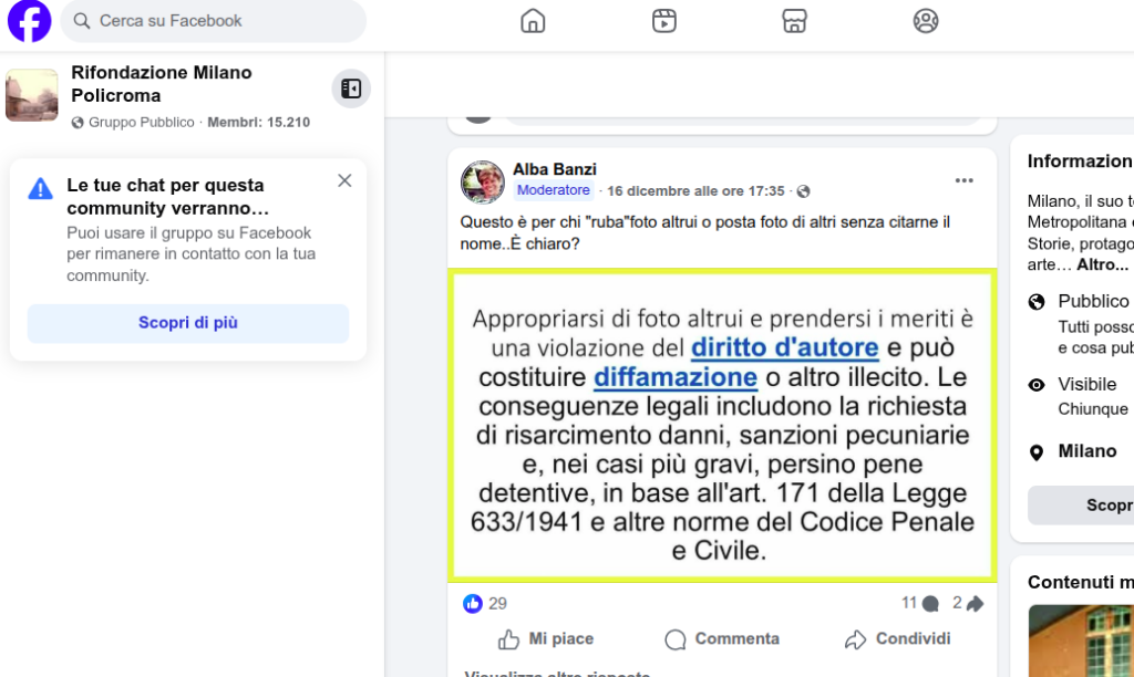 FREQUENTI VIOLAZIONI DEI DIRITTI D’AUTORE IMMAGINI E CINEMATOGRAFICI PER LE IMMAGINI UTILIZZATE IN MILANO SPARITA FACEBOOK E HOME PAGE DELLA BARONA E DI ALTRE DERIVATE FACEBOOK DI NATURA COMMERCIALE PUBBLICITARIA, DISINFORMATIVA E PROMOZIONALE DELLE TESTIMONIANZE FOTOGRAFICHE DELLA STORIA DI MILANO. IL FORUM E’ DEGNO DI INDAGINI GIUDIZIARIE