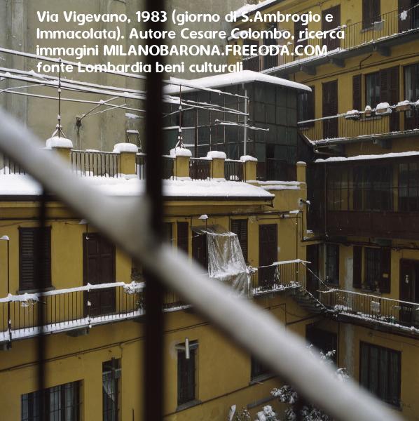 CESARE COLOMBO, VIA VIGEVANO (INNEVATA), INTERNO CASE DI RINGHIERA, ANNO 1983, 7, 8 DICEMBRE. LA DATAZIONE DI TALE IMMAGINE, IN VIRTU’ DELLE INIZIALI ANOMALIE CLIMATICHE CHE GIÀ IMPERVERSAVANO IL NORD ITALIA, È, CON