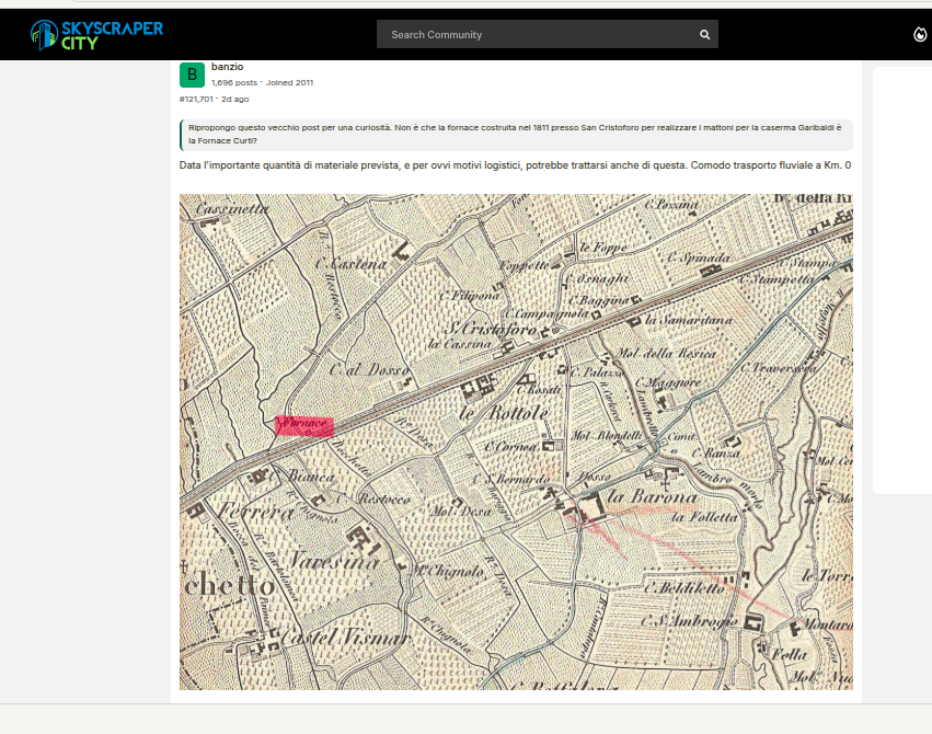 DI PUTTANATE NE POSTA PARECCHIE… INSIEME AD ALTRI PARI COJONI COME ANDREA D’ONOFRIO, ROBERTO BAGNERA E ALTRI AUTORI, NESSUNO DI LORO NATO NEMMENO A MILANO… LA FORNACE CURTI (TEORICAMENTE UBICATA NELLE PERTINENZE DI CIO’ CHE, A CAVALLO TRA L’800 ED I PRIMI DEL 900, ERA PRESUMIBILMENTE LA “CASCINA VARESINA” )NON SI È MAI AFFACCIATA SUL NAVIGLIO… CIO’ CHE UN TEMPO ERA FORNACE CURTI SI LOCALIZZA ALL’INCROCIO TRA VIA COTTOLENGO (COLOMBINI ERA DA INTERNARE NEL MANICOMIO DEL COTTOLENGO…) E VIA WALTER TOBAGI… NON SIAMO LUNGO L’ALZAIA NAVIGLIO GRANDE E LUNGO LA VIA LODOVICO IL MORO… OLTREMODO TALE SITO NON È IL BORGO DI SAN CRISTOFORO CHE COME PIU’ VOLTE SCRITTO TALE EX BORGO INCLUDE UN LEMBO CONFINANTE DELLA BARONA COL LEMBO DEL GIAMBELLINO COMPRESO TRA VIA PESTO, VIALE TROYA E VIA SAN CRISTOFORO… A TALI CENTRO MERIDIONALI (BAGNERA, D’ONOFRIO, DELL’OGLIO, TOSI, COLOMBINI, ETC…) SPACCIATI PER MILANESI DOC DA UN MILLENNIO DI STIRPE GENERAZIONALE NOBILE (ANCHE IL PEZZANO SI SPACCIA PER MILANESE DA 7 GENERAZIONI MALGRADO SIA DI PALIZZI CALABRA) SI DOVREBBE SPIEGARE CHE IL NOME “STAZIONE FS DI SAN CRISTOFORO” ASSEGNATO DA SECOLI ALLE STAZIONCINA FS DI PIAZZA TIRANA DERIVA DAL NOME DELLO “SCALO DI SAN CRISTOFORO” CHE A SUA VOLTA ERA PARTE DELLA STAZIONE DI PORTA GENOVA… PIAZZA TIRANA NON FA PARTE DELL’EX BORGO DI SAN CRISTOFORO… (UN PO’ COME AVVIENE CON CASTIGLION FIORENTINO CHE SI TROVA A 80 E PASSA KM DA FIRENZE MA SI FREGIA DI TALE NOME)