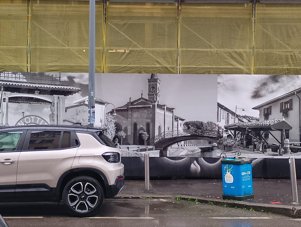 VIA FRANCO TOSI (IL COSIDDETTO BORGO SAN CRISTOFORO, NEL QUALE SAREMMO OLTRE I LIMITI STORICI)… HINES COIMA DI MANFREDI CATELLA, PER SUPERQUOTARE I FUTURI APPARTAMENTI INCOLLA MANIFESTI E CARTONATI IN FALSO BIANCO E NERO RITRAENTI LA CHIESETTA DI SAN CRISTOFORO…