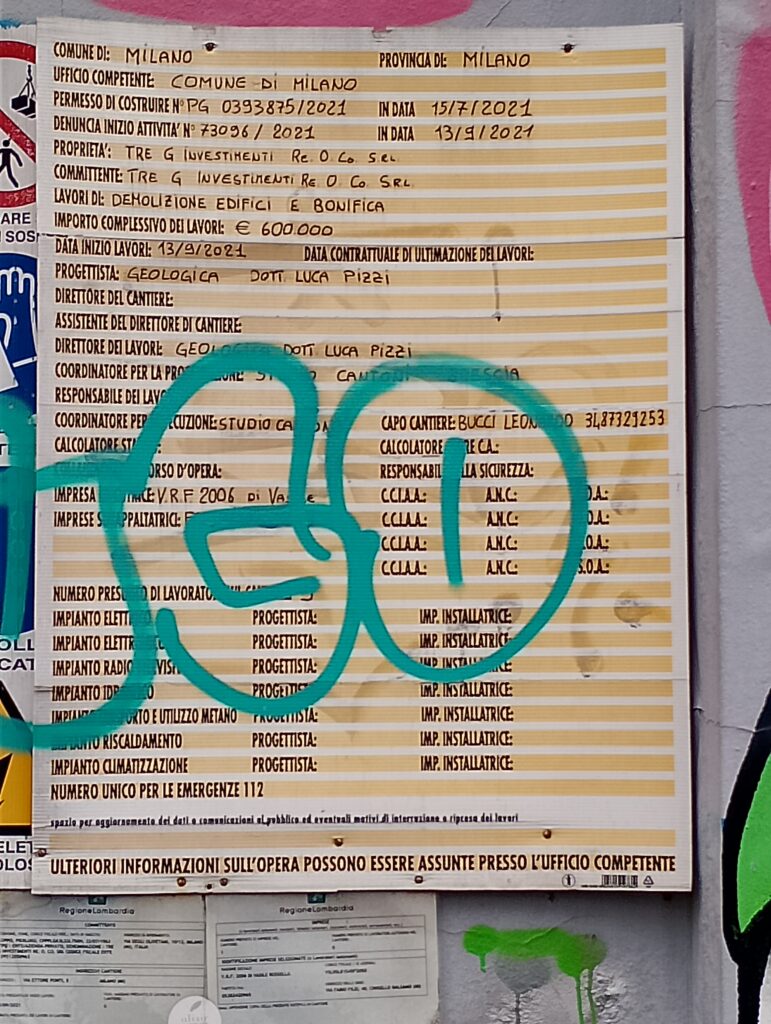 SEMPRE VIA FRANCO TOSI (IL COGNOME TOSI FA VENIRE I CONATI DI VOMITO A CHI SCRIVE, SI VEDA L’OMONIMIA COL STEFANO TOSI). IL CORTILETTO RITRATTO (SORGEVA UN PICCOLO MAGAZZINO, FORSE, A SUO TEMPO, DEPOSITO ANCHE DI SOSTANZE CHIMICHE E COMBUSTIBILI… CONFINAVA CON UN’ALTRO MAGAZZINO DEPOSITO DI PROFUMI UN CUI MURO DI CINTA CEDETTE NEL LUGLIO 1988 DURANTE UNA TROMBA D’ARIA…) DEVE OSPITARE IL “BOSCO VERTICALE DELLA BARONA E DEI NAVIGLI”, ERGO DUE TORRI, UNA DELLE QUALI PROSSIMA AI 17-18 PIANI IN UN CORTILETTO ED IN VIOLAZIONE DEL PIANO REGOLATORE CHE VIETA DI COSTRUIRE EDIFICI SUPERIORI AGLI 8 PIANI INCOLLATI AD ALTRI EDIFICI DI RESIDENZA… COME VISIBILE NELLE SUCCESSIVE IMMAGINI, IL CANTIERE PUR AVVIATO NEL 2021 È ATTUALMENTE FERMO, NEL FRATTEMPO SONO AVVENUTI DEGLI SCAVI GEOLOGICI PER COSTRUIRE UN SUBSTRATO GEOLOGICO DOVE PREDISPORRE DELLE POMPE GEOTERMICHE… OVVIAMENTE I MILIONARI CHE DOVREBBERO RISIEDERE IN TALI TORRI VOGLIONO RISPARMIARE SUI COSTI DI METANO… EDIFICI DESTINATI A GRANDI EVASORI ITALIANI, USA, UK, RUSSIA, EMIRATI ARABI, MAFIOSI (COME ADRIANO PEZZANO), CALCIATORI E STARLET…