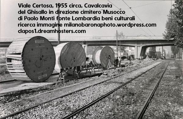 Viale Certosa, in direzione Cimitero Maggiore di Musocco, 1955 circa, autore Paolo Monti. In evidenza il cavalcavia del Ghisallo (pochi anni dopo vi avrebbero girato le riprese del film del 1959 “Audace colpo dei soliti ignoti” . Si notano, accorgimenti “elettrici” delle linee aeree di captazione elettrica tranviaria, ovvero la presenza di un terzo cavo, non di contatto, che alimentava la linea di contatto elettrico della rotella dei trolley. Sovente nelle strade periferiche (come lo era anche la tratta Via Pestalozzi, Via Ambrogio Binda, Via Biella e anche per la via Lodovico il Moro, in parallelo ai cavi aerei di contatto vi era un quasi indistinguibile terzo e quarto cavo (uno per senso di marcia) di alimentazione… tale accorgimento era dovuto al fatto che nelle tratte periferiche i trasformatori ed i deviatori elettrici (da non confondersi con i deviatori dei binari) erano assenti e si rendeva necessario implementare dei prolungamenti, dalle zone più centrali (lunghi anche chilometri) ,che alimentassero elettricamente le linee tranviarie sino al capolinea periferico (vedasi anche il 18 lungo Via Forze Armate… mentre nei quartieri ZARA e BICOCCA, la presenza di molte sottostazioni elettriche in corrente continua rendeva superfluo il cavo parallelo di alimentazione).