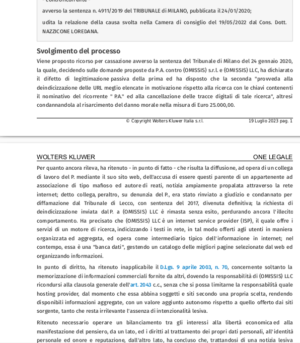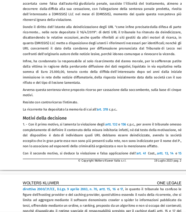 SI RIMANDANO AI PROSSIMI GIORNI GLI APPROFONDIMENTI DI QUESTO SCANDALO GIUDIZIARIO CHE VEDE NON UNA CONTROPARTE MA DUE CONTROPARI VITTIME DELLA MALAGIUSTIZIA PILOTATA DAI PEZZANO SUCCITATI E DAL LORO STUDIO LEGALE… IN CONCLUSIONE A QUESTA DIFFICILE TRATTAZIONE SI ALLEGA L’ESTRATTO DEL DIBATTIMENTO DEL PROCESSO DI PRIMO GRADO PRESSO IL TRIBUNALE DI LECCO, TENUTOSI IL 17-2-17… A DIFFERENZA DELLE FALSITA’ SENTENZIATE NEL DISPOSITIVO DI CONDANNA DEFINITIVA DEL 19 MAGGIO 2022, SI SCOPRE CHE IN TALE UDIENZA E SENTENZA NON ESISTE ALCUNA ORDINANZA EMESSA DAL GIUDICE NELLA QUALE SI IMPONEVA ALLA PARTE IMPUTATA DI CONTATTARE L’UFFICIO LEGALE DI GOOGLE E CHIEDERE LA RIMOZIONE DEGLI URL DI INDICIZZAZIONE CHE PUNTAVAO VERSO WEB ESTERI SUI QUALI, NON PENDEVA ALCUNA CONDANNA DEFINITIVA… PER IL CODICE PENALE E CIVILE ITALIANO, GOOGLE NON PUO’ ESSERE CONDANNATA PER LA PRESENZA DI URL indicizzati CHE PUNTANO VERSO WEB ESTERI SUI QUALI NON PENDONO CONDANNE DEFINITIVE…